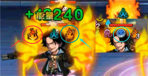 左侧红色圆圈内为“火柱标记”,中间蓝色圆圈内的为记录“爆燃标记”暴击的特殊标记,右侧那个艾斯帽子上的标志性笑脸则为“火的意志”状态。