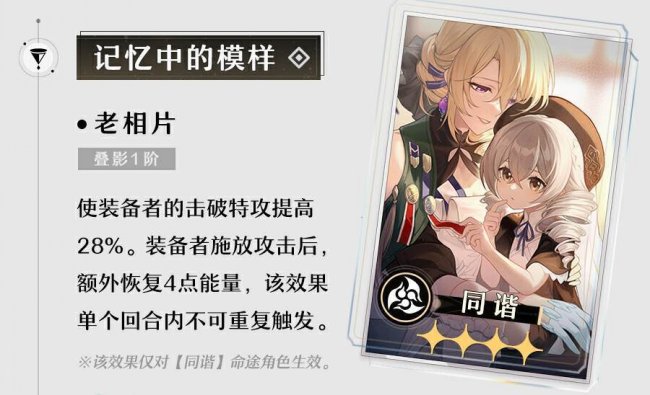 叠影5时提供40%击破特攻,并使装备者施放攻击后恢复8能量,单个回合仅能触发1次。