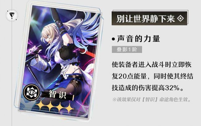特效2在叠影5时提供64%终结技伤害加成,数值不低,但目前基本没有完全依赖终结技输出的智识角色,因此也就更没有抽取光锥「别让世界静下来」的必要。