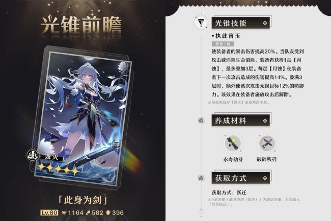 对其他角色来说,则不太需要抽取「此身为剑」,毕竟该光锥的效果只能无条件吃暴伤加成,且该部分数值不高。后续的特效都需要使队友受到攻击或消耗生命,很难吃满,对于刃来说直接用4星光锥「秘密誓心」即可,对其他毁灭角色来说黑塔商店白嫖的「记一位星神的陨落」则也是优质选择。