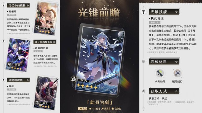 镜流专属光锥「此身为剑」,光锥面板是比较中规中矩的582基础攻击,虽然没有当初饮月专锥高达635基础攻击的惊艳,但作为5星光锥依旧是相当合格的数值。