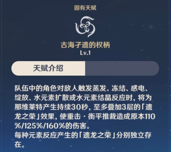 由于众所周知的原因,大家知道,龙王的1命很重要,主要原因有二:一是登场直接获得一层固有天赋「古海子遗的权柄」的「遗龙之荣」,类似于神子2命一部分特效,二是重击抗打断,获得战场霸体,两个特效都对之后的队伍有所优化,下面配队我会着重的去说。
