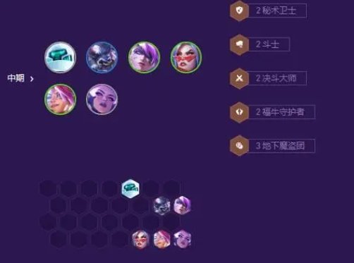 阵容羁绊:5地下魔盗团、3源计划、2斗士、2决斗大师、2枪手、1精英战士