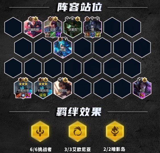 这是一套3费赌狗阵容,核心就是偏冷门棋子卡莉斯塔,装备主C卡丽丝塔:诡术师之镜+鬼索的狂暴之刃+珠光护手,副C亚索:泰坦的坚决+饮血剑+夜之锋刃,建议开局有诡镜在考虑,由于有诡镜战力很强,建议走连胜,2-1升4人口,2-5升5人口,过渡阵容3艾欧+2挑战+2主宰,或选择现在过渡最强的3诺克过渡。