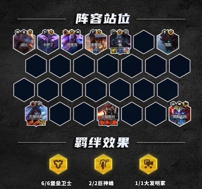 这套阵容与堡垒巨神射、卓德巨神射最大得不同就是堆前排坦度,不是说那两套不强,只是在当前6堡垒更适合当前环境,阵容开了6堡垒羁绊,开局6堡垒棋子增加得100双抗翻倍,堡垒棋子双抗可达到240-260.开局1-4建议只上艾瑞莉娅右上第一个格子站位,能单杀野怪,多一块经济。