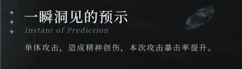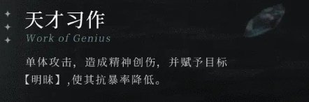 他的一技能叫做天才习作是单体攻击,可以对敌方造成一定的精神创伤,并且还会赋予目标一定的控制让敌人的抗暴击率再一次降低。他的二技能叫做众望瞩目,这是一个群体攻击技能,可以对敌人两名以上的敌人同时造成精神攻击,并且增加穿透力。 大招则是一瞬洞见的预示,这一技能也是单体攻击,但是受到伤害的目标遭遇的精神攻击是非常强大的,同时也会增加一定的攻击效率。