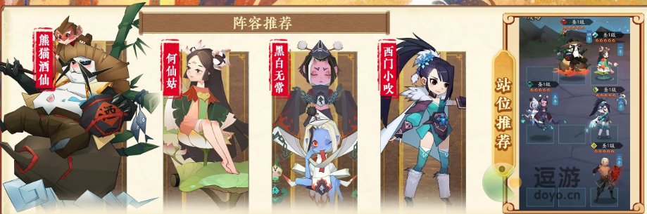 1、普通版阵容:熊猫酒仙+何仙姑+黑白无常+西门小吹+武圣主角