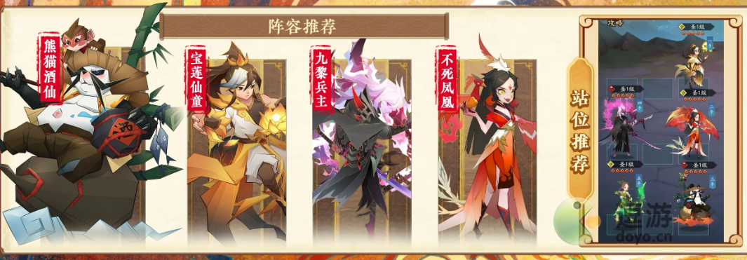 3、豪华版阵容:熊猫酒仙+宝莲仙童+九黎兵主/灭世之刃+不死凤凰+主角