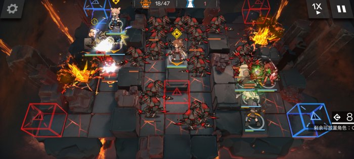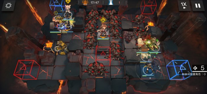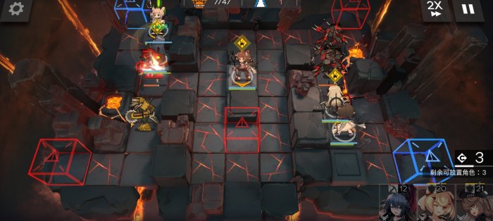这一关是两个比较对称的战场,我们必须在左上和右下布置两个相对平行的阵地,才能挡住提亚卡乌敌方单位的冲击。左上方可以由星极担任防御,古米作为协助。右下方则由苇草担任防御,蛇屠箱作为协助,由于先锋干员挡位不足,再安排杰西卡作为支援,两个阵地各自布置一名医疗干员。
