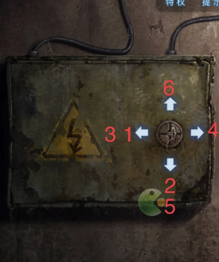 根据外面地上灯光提示:红蓝黄黑红,解开电箱右边机关灯亮;