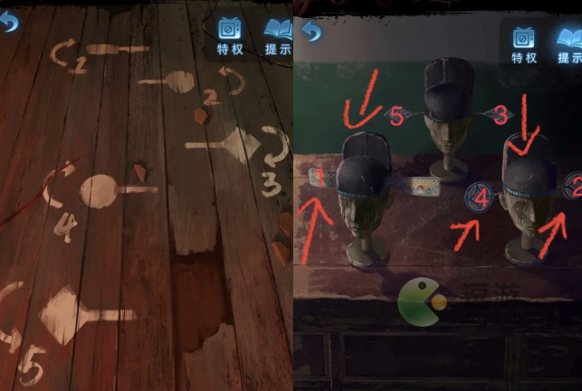 2、点击棋盘获得下面的【上锁盒子】,交给小萓打开得到【几本书】和【空盒子】,根据地板上图案提示,按顺序拨动桌子上木偶头上的帽翅,用空盒子抓小人得到【钥匙】;