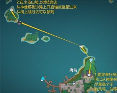 2:在小岛山坡上树枝旁边从神像那到沙滩上开启锚点坐船过来从树上跳过去可以够到