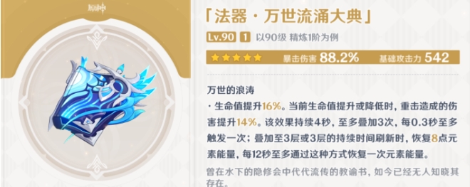 全新五星法器万世流涌大典,五星最低白字,最高副词条,副词条为88.2%暴伤。武器特效为:直接提升生命值,当生命值发生变动时,提升重击造成的伤害,至多叠加三层。当叠加至三层或三层的持续时间刷新时,恢复元素能量,每12秒至多恢复一次。