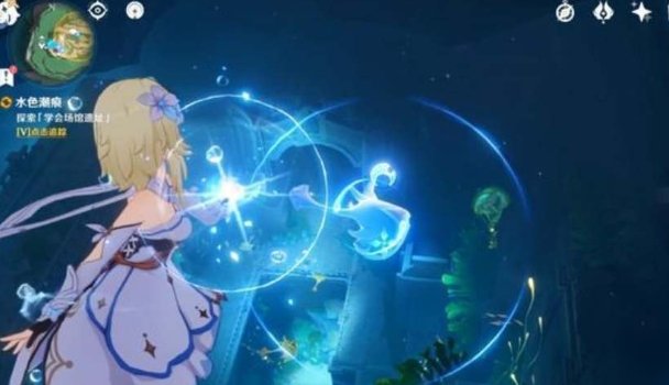2、从水下潜水后往前游可以找到一个蓝色的神秘法阵,按照任务要求去寻找3张神秘的书页;