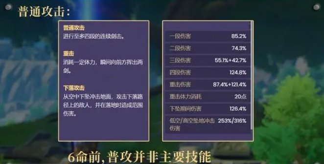 6命前普攻主打物理伤害,没有实战价值,6命后开E获得风元素附魔,普攻才具有输出价值。