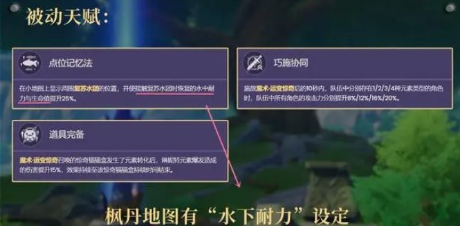 这个天赋非常有意思,从技能设计上看,枫丹的水下地图可能会有类似于雪山的耐力机制,入水后消耗“水中耐力”,耐力耗尽时会开始消耗生命值。玩家需要找寻复苏水团恢复耐力和生命值。雪山的耐力机制被很多玩家诟病,不知道这次的水下耐力会有什么新设定。
