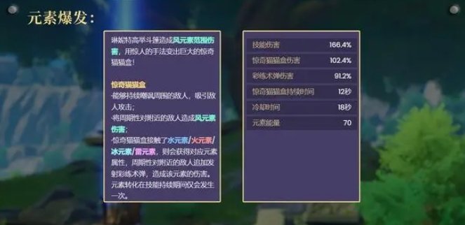 造成一段范围风伤,12级倍率166.4%,随后生成惊奇猫猫盒,嘲讽敌人并间歇性造成风伤,12级倍率102.4%。接触水、火、冰、雷时会发生染色,攻击时追加91.2%倍率的对应属性伤害。