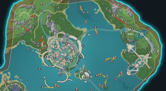4.0的枫丹地图不复杂,基本所有传送点都很容易就可以点亮,跑起来也简单。红色路线是地面,黄色路线是水下