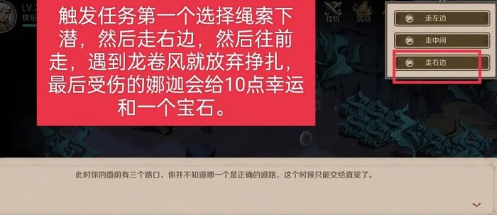 走右边,然后往前走,遇到龙卷风就放弃挣扎,最后受伤的娜迦会给10点幸运和一个宝石。