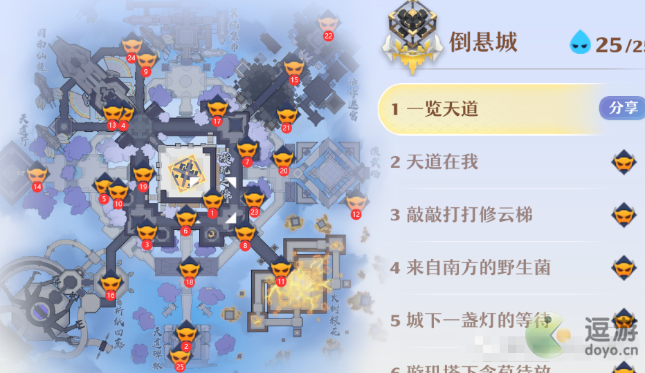 1、倒悬城探灵位置如图,因倒悬城地形较为复杂,如到以下地点未找到,可适当往高处或低处某角落寻找