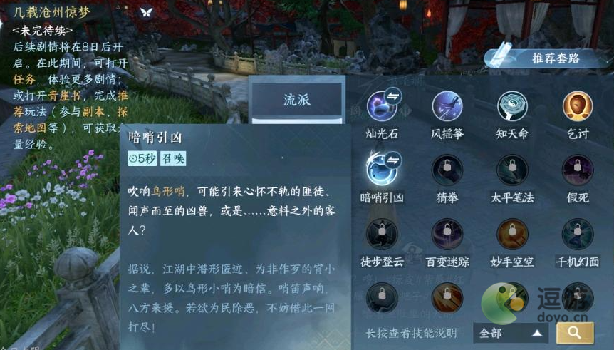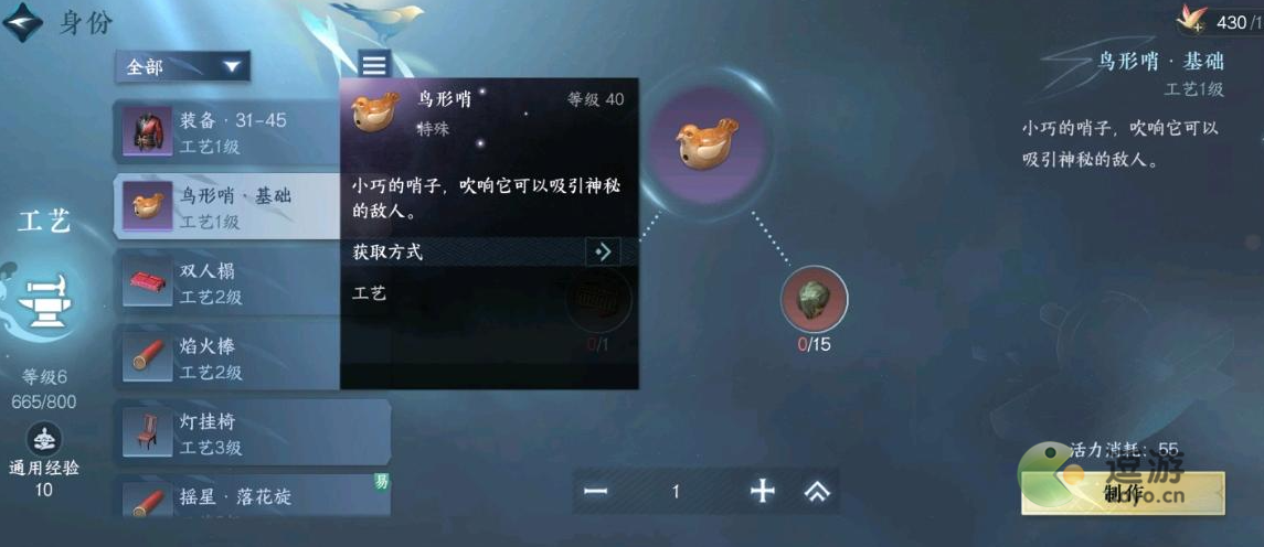 2、解锁暗桩获得趣味技能【暗桩引凶】;使用趣味技能需要消耗鸟形哨,鸟形哨在身份-工艺里制作,需消耗15个青铜矿石和55点活力。使用【暗桩引凶】后,会吸引来神秘的敌人,部分敌人会秒人需要组队击杀,击杀后概率掉落金色内功。