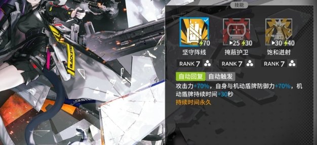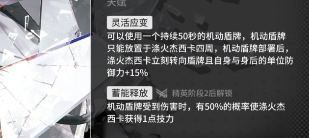 第2个天赋就有点不如雷蛇的了,如果是机动盾受到了攻击会给附近干员和杰西卡充能那还是非常神中神的,但是只给杰西卡自己充还是百分之50只能说有点拉胯