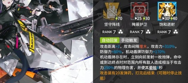 攻击加百分之310 机动盾加百分之170,自身防御加百分之80 有20发子弹,而且有机动盾的情况下会射一发rpj,命中后6秒眩晕造成攻击百分之250的伤害