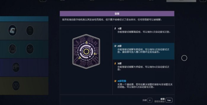 安保:开锁,可以打开上锁的保险柜、门、电脑等。建议点两级,会有个很好用的提示。