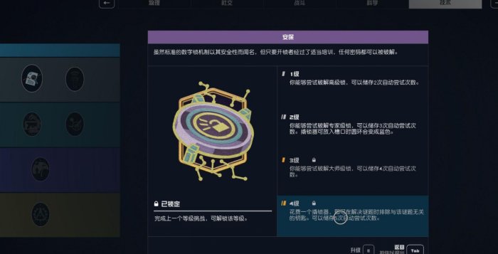 安保就是可以开更高级的锁,我们做任务去探索一些区域,经常会遇到一些高级的箱子或者是门,没有高等级的安保都打不开,看到箱子和门打不开的滋味,是很难受的,可能会错过很多好东西。