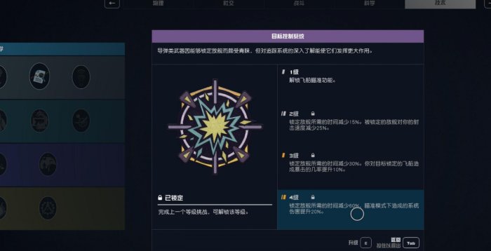 目标控制系统主要用于太空战斗,可以锁定敌方飞船精确打击,这个对于打架能力提升很大,而且任务里面有不少太空战斗的情景,又不太好操作,这个技能就至关重要了。