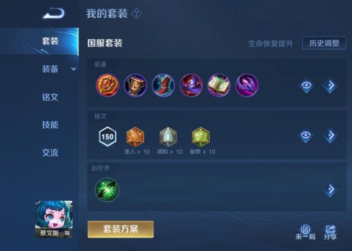 蔡文姬的出装基本没有争议,问题是出装的顺序,前期的出装细节很重要,细节可以看上面的图片,因为蓝耗太严重,所以先把圣杯做出来是关键。召唤师技能上也要根据阵容来选,常规可以带治疗,如果控制太多或者是开团太强,怕开不出来大招,还是要带净化的。