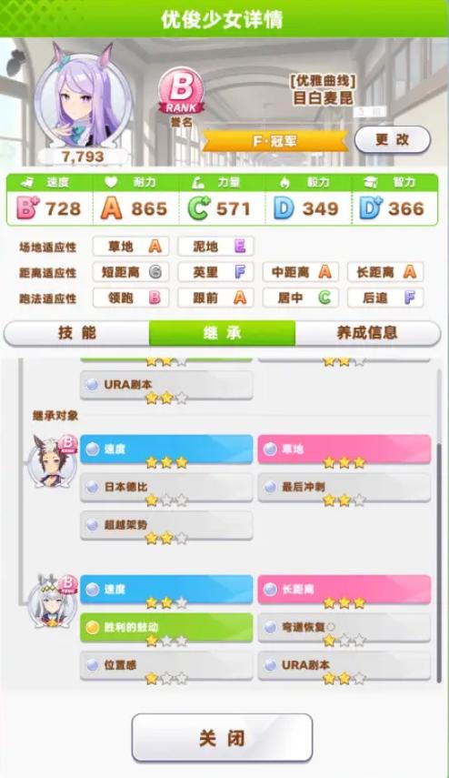 因为我继承的时候,主要继承速度,所以耐:速,基本是3:2,剩下可以点点智力,保证不卡技能。(感觉智力300就够用),麦昆决赛是中距赛事,但是可以通过爆耐力,遥遥领先。