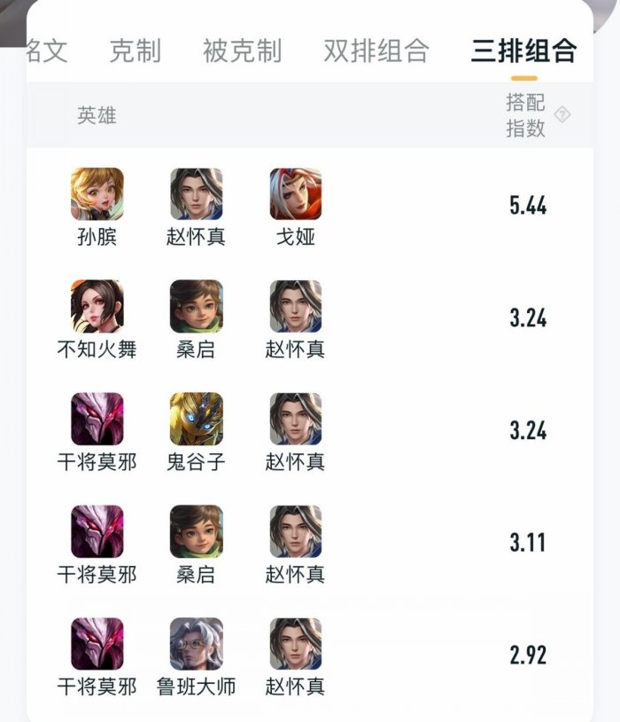 一些功能性辅助会比较合适,比如孙膑,桑启,鬼谷子这些英雄,赵怀真自身拥有一定的坦度,可以充当前排,搭配功能性辅助可以打出更好的效果。在营地的双排或三排组合中,我们可以看到这三个功能辅的数据十分亮眼。