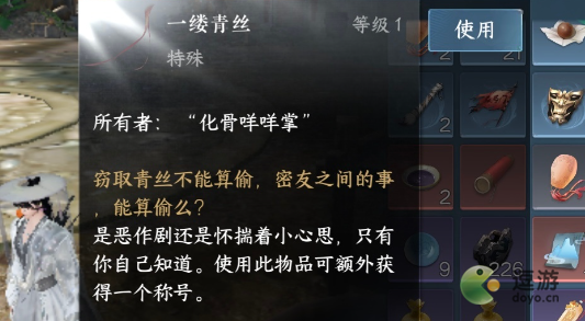 2、使用【妙手空空】可以偷其他玩家的交子,概率获得一缕青丝,拿到一缕青丝后可获得永久称号”xx的仰慕者“(同类型称号只能拥有一个,获得新称号后旧的仰慕者就会失效)。