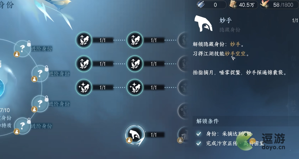 1、解锁妙手身份之后可以获得趣味技能妙手空空,解锁条件:①身份-采摘达到6级,②完成汴京正传·高府密室