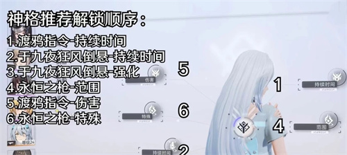 根据这些能力,神格的解锁建议如下:1、持续时间(渡鸦指令);2-持续时间(爆发技能于就业狂风倒悬);3-增强(爆发技能于就业狂风倒悬);4-射程(永恒之枪)5-杀伤力(渡鸦指令)6-特种(永恒之枪)。