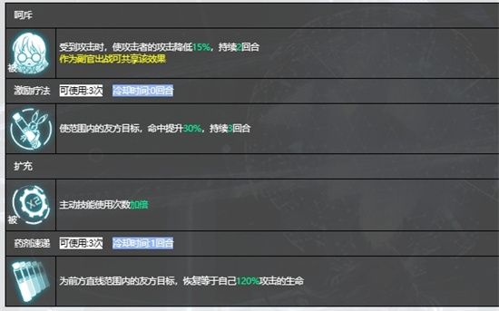 茱莉亚的第一个主动技能就是激励疗法,该技能可以在三轮当中为指定范围内的友军增加30%的命中率,对于那些命中率不高但对命中率要求很高的特工来说,这是一个很好的辅助技能,例如狙击手,爆裂手等等。这是一个6连击,无CD的大招,因此在战斗中可以根据不同的战斗环境进行调整。通常情况下,都是在战斗初期,特别是面对某些躲避能力强的对手时才会使用。茱莉亚还有一个被动技能,那就是药剂速递,这个技能可以让茱莉亚在战斗中获得120%的伤害加成,也可以让她在战斗中发挥出最大的作用,让她的队友能够在最短的时间内恢复到满血状态。这个技能可以发动三次,一轮一次,所以你要小心。通常情况下,都是在自己的队友遭受重创的时候,或是在对方要给予自己致命一击的时候才可以释放。