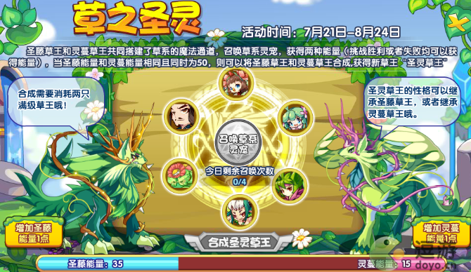 3、本活动需要考验小洛克们一些计算能力,挑战不一定要成功!时刻关注两遍能量的变化从而调整作战方针!只要圣藤与灵蔓能量均达到50就可以开启:圣灵草王 合体