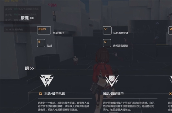 明在游戏中属于一个控制影响型的,她在技能释放时可以对敌人的护甲进行破解,而且破解的程度较高。在使用主动技能时,明会发出一个电球作为攻击的武器,电球的覆盖范围较广,基本上最远距离的敌人也可以被覆盖到。在电球发送之后,点球会靠近敌人,玩家在点球靠近敌人身边时按下释放键,那么电球就会爆炸并产生伤害。