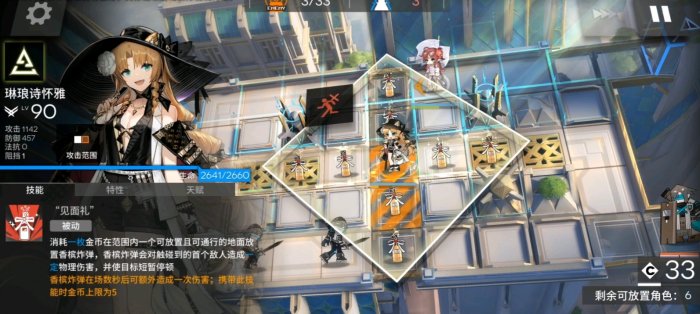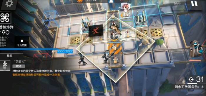 简评:该技能实战中可部署【香槟炸弹】的范围应为类似于大哥的十字范围。该技能实战限制很明显,要求攻击范围内没有敌人时才可以消耗金币部署炸弹,所幸本体攻击范围只有自身这格和身前一格,这导致持续接敌时无法触发二技能效果,不过这段时间内特性仍旧3秒会获得一金币。实战中【香槟炸弹】可以造成多次伤害的场合有一些,造成物理伤害并停顿的效果类似于W二技能造成一定物理伤害并晕眩,不过考虑到W在摆完挂机实战中已经基本没有发挥,该技能在日常的发挥也缺乏期待感。