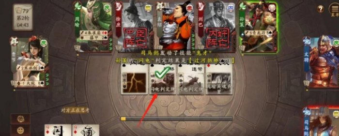 点击确定后并扔出闪电生效牌黑桃3.此时可以看到游戏内会弹出小窗口显示闪电判定结果为扔出去的黑桃3