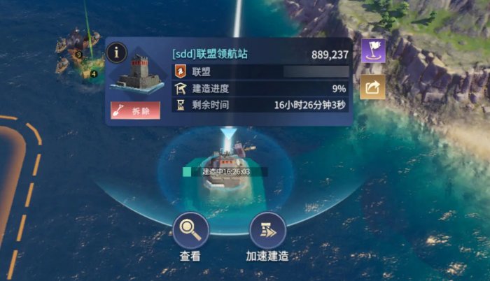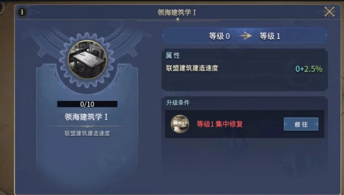 提升领航站建设速度的主要有两个方面,一是联盟成员的驻守加速,这方面联盟官员可以在建设时多多号召,驻守的人越多,建造速度越快;另一方面也可以通过提升联盟科技中的【领海建筑学】加快基础建设速度。