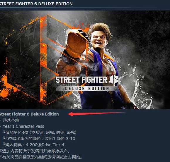 街头霸王6豪华版:国区售价488元,包含标准版内容,包含第1年度通行证、追加角色4位、追加角色的颜色、购入特典4200张Drive Ticket。