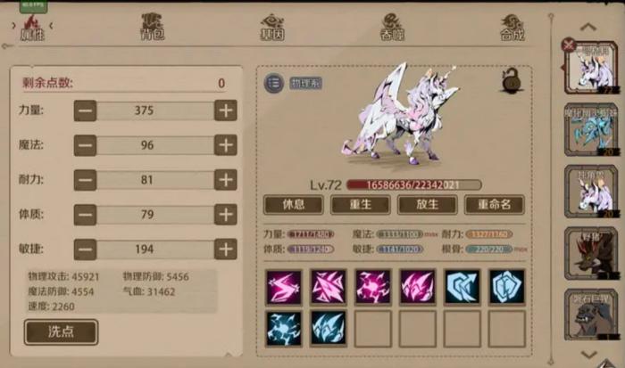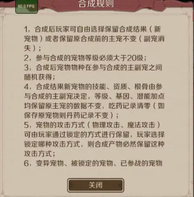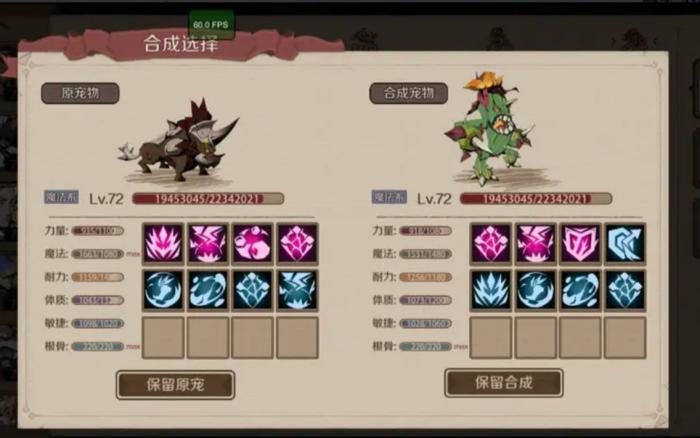 2、宠物合成是这个游戏一个很重要也很有趣的玩法(只有普通宠物可以,魔化不能合成)2个宠物等级达到20级且无上锁状态,就可以进行合成。合成把自己的目前使用宠物当主宠,材料宠放副宠位置,这样就可以进行合成了,合成之后会出现一个界面,左边为自己主宠宠物,右边是合成新宠物,这个时候就需要我们来选了,如果新宠物不愿意,就保留原来宠物,这样我们的战力也不会有损失,新宠物如果资质技能都可以,那我们就选择新宠物。选择了新宠物大家也不用担心原来宠物的等级基因没了,新宠物会继承原先宠物的等级基因。(当前最高为8技能宠,目测后续还会开放更多)