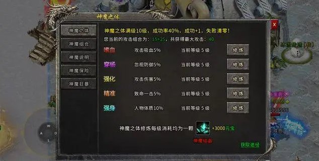 点神魔4级之前不需要考虑什么技巧,硬点就好,优先去点吸血,强化,精准到4级,然后这三个4级的先别点,这个时候开始点穿杨跟强身,同时开始记录失败的次数,从0上1不算,从1上2开始算,连续失败五次以后开始点前面三个4级的,一般只有两种情况 (如果4上5失败,那么继续点穿杨跟强身,失败五次以后,再去点另外两个4级)