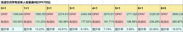 根据以上数据,可以看到饮月2魂提升率非常之大,6魂次之。5魂提升率较小。所以这里建议有预算可以抽到2魂。不过实战中由于战技点的限制,2魂的提升率应该不会这么夸张,但至少也有30%。