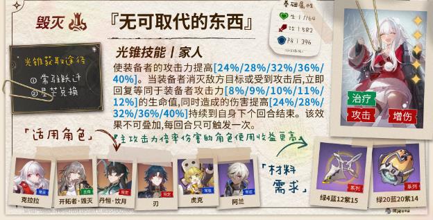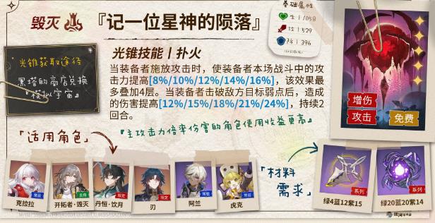 常态提供攻击力加成,被敌人攻击或者击杀敌人还能获得增伤收益。同时还提供基于攻击力转化的生命值恢复效果。饮月作为毁灭命途的角色,在队伍中如果没有存护在一般就是挨打第一人,这个光锥提供的增益基本可以等同于常驻,整体的收益(叠影1)目前排在第三,但如果考虑到「记一位星神的陨落」需要叠层启动的话,那么使用这个光锥会比较省心。属于有的话可以用,没有的话用星神就行。
