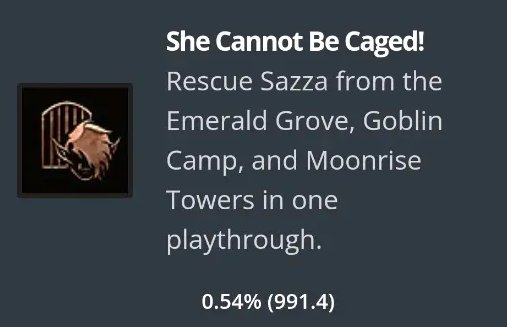 "放了她"这个成就要求玩家解救萨扎三次。在第二次解救萨扎时,她说她要去隐居,然后消失并出现在月见塔中。如果您无法找到她在月见塔的位置,可能是因为游戏的随机生成特性导致她的位置不同或者有特定的触发条件需要满足才能看到她