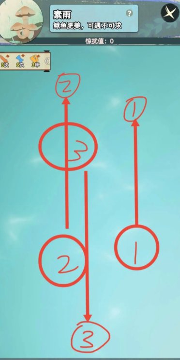 重点来了,如果一开始就点到【3】号点,鱼向下运动轨迹会和【2】号点重叠,这样的话,就容易同时触发两条鱼同时运动。一来不好抓,二来惊扰值飙得快。