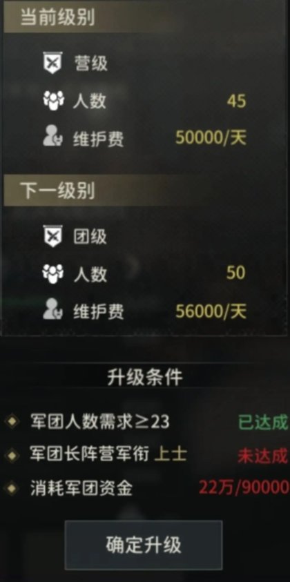 军团一开始上限是40人军团等级是连级,达到条件可以升级每升一级军团人数上限+5